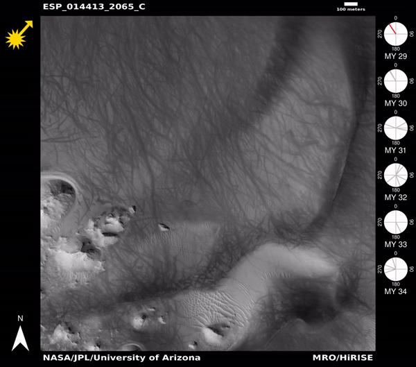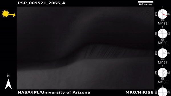 Các cồn cát trên sao Hỏa cũng liên tục thay đổi. Hình ảnh động sau đây tập trung vào bốn đụn cát nhỏ thay đổi trong suốt trình tự.